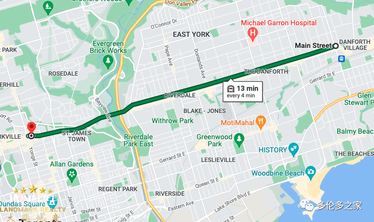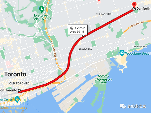 Tony指的是位于 Main 和 Danforth 拐角处的三种通勤选择,就像上图所见,不仅可以可以乘坐 Bloor-Danforth 地铁(又名 2 号线)、506 街车或或搭乘 GO 火车,无论是哪一个选择,最慢15分钟内即可到达市中心。“当地产经纪谈论投资价值高的区域时,这应该就是你客人需要看到的。”