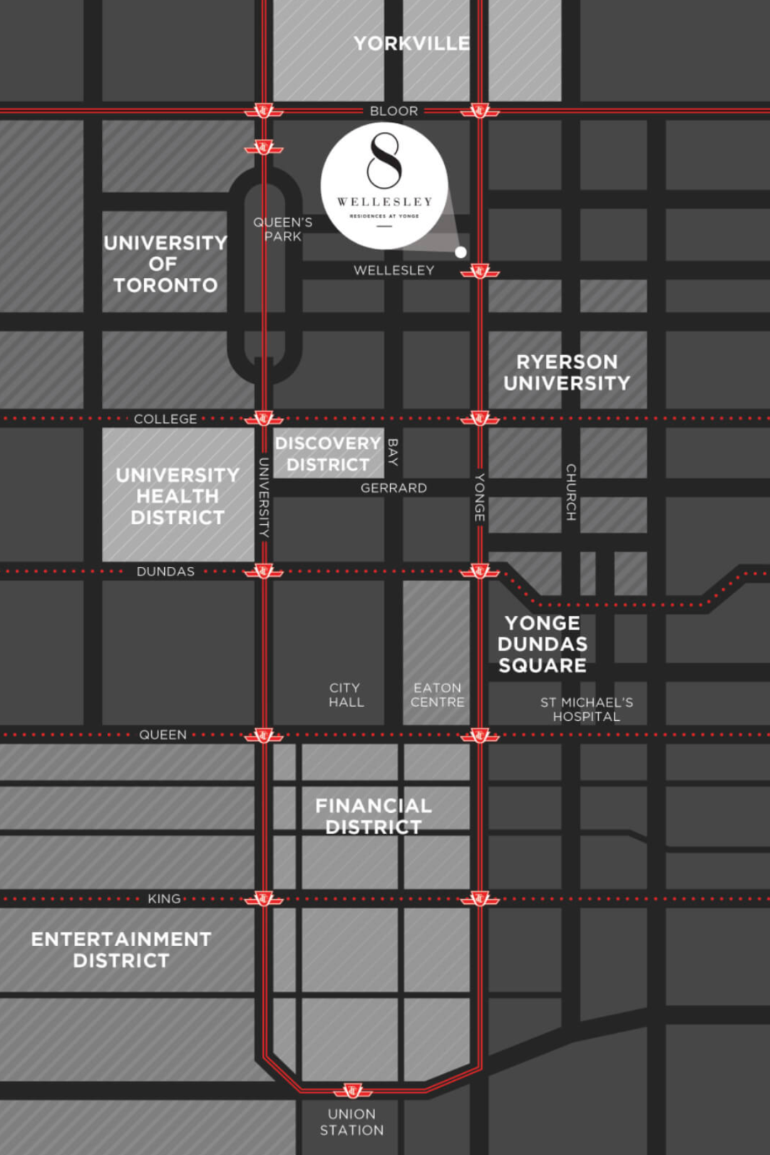 8 Wellesley的地理位置可以说是风水宝地,隔壁即是女王公园和著名的奢侈品一条街Bloor St。它坐落在多伦多的中心点。不仅周围有着各类餐厅、商铺、银行、公园、健身房、医院等等设施可以满足居民生活需求,而且还靠近加拿大第一大学 — 多伦多大学的主校区。