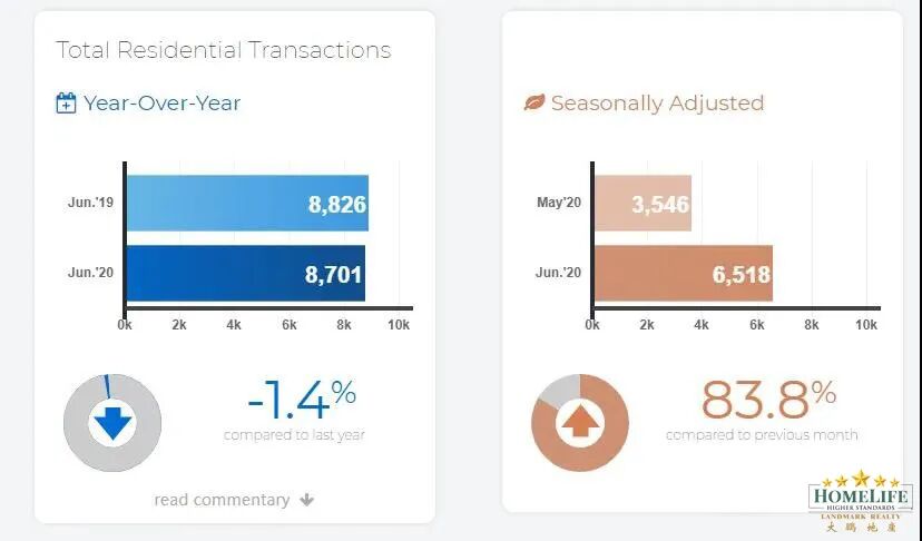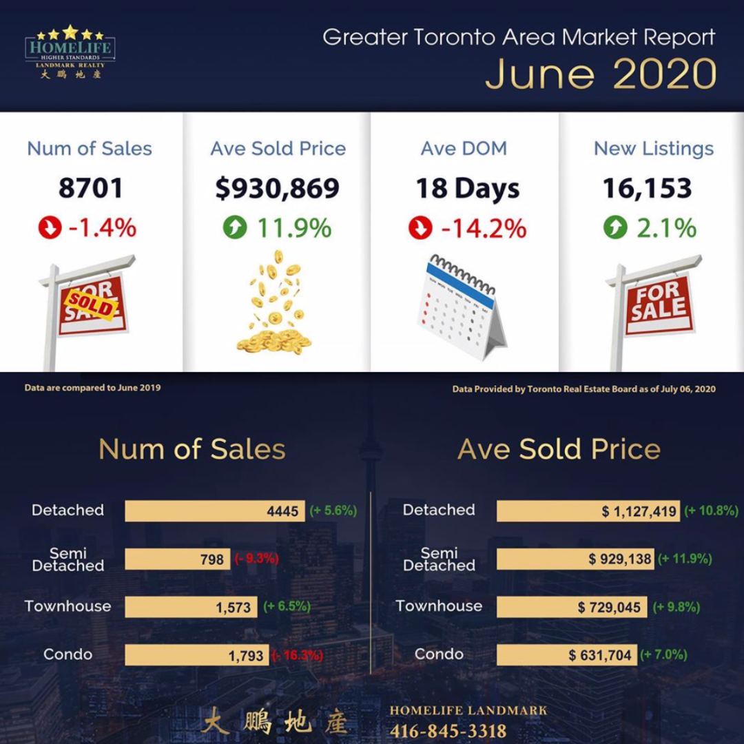 多伦多地产局(TREB)上周发布的月报表明,刚刚过去的6月份,大多伦多地区有8701套各类房屋成交,仅略低于一年前的水平(同期相比下降1.4%)。6月MLS®房屋价格指数综合基准上涨8.2%,实际平均成交价为$930,869,比去年同期上涨11.9%,比上个月增长7.8%。