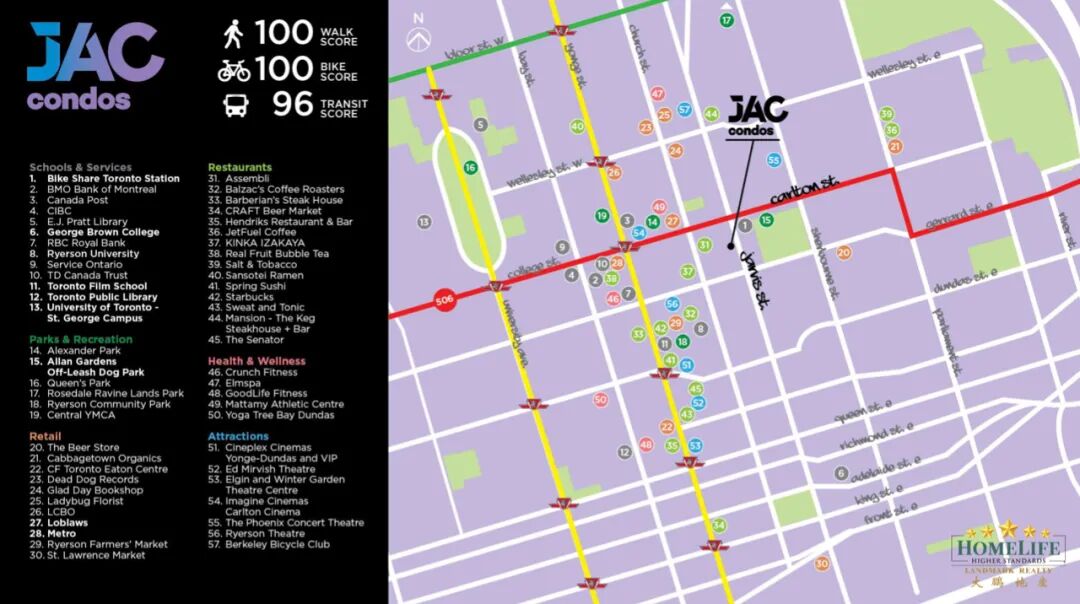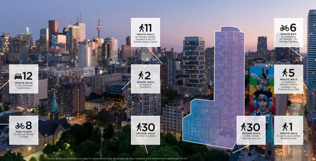 JAC位于Jarvis & Carlton的西南角,地址是308 Jarvis St, Toronto。楼盘四通八达,给学生和附近上班的人员大幅度地减少了通勤的时间,同时距离大楼 30步之遥的便是多伦多历史最久的公园之一Allan Gardens。