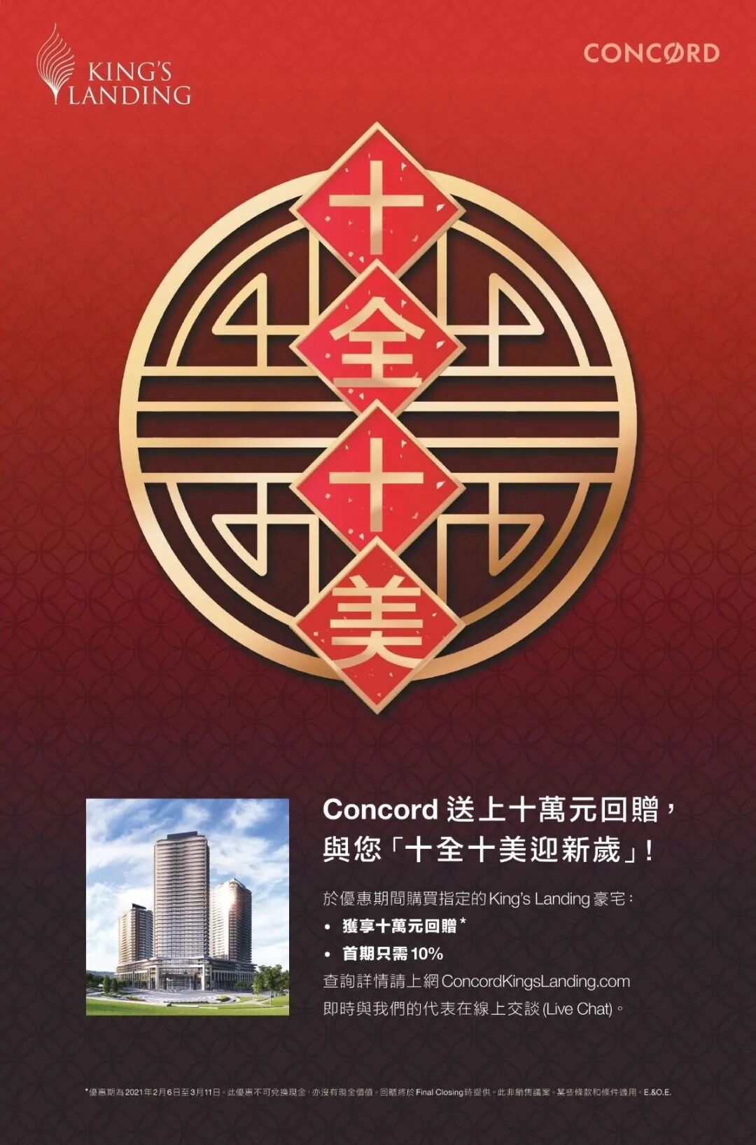 在优惠期间购买指定的King’s Landing豪宅,获享十万加元回赠,并且首期只需支付10%。优惠期为2021年2月6日至3月11日,也欢迎大家随时和我联系以获得更多资讯。