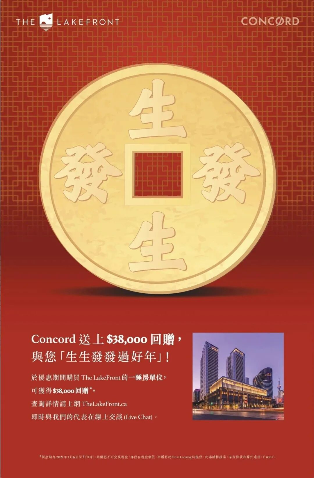 The LakeFront是多伦多湖滨区炙手可热的项目之一,坐拥湖滨核心地段,身处地标建筑Loblaws旗舰店之上,前景令人期待!本次活动,Concord送上$38000的回赠,与您生生发发过好年!