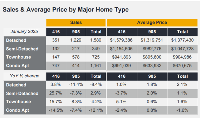 多伦多地产局 (TRREB) 近日发布了2025年1月房地产月报,整个大多伦多地区在1月份共售出3,847套房子,比2024年1月下降7.9%,当月房屋平均售价为1,040,994加元,比2024年1月增长1.5%。针对独立屋而言,万锦独立屋平均价1月同比大跌8.8万,列治文山跌6.2万。